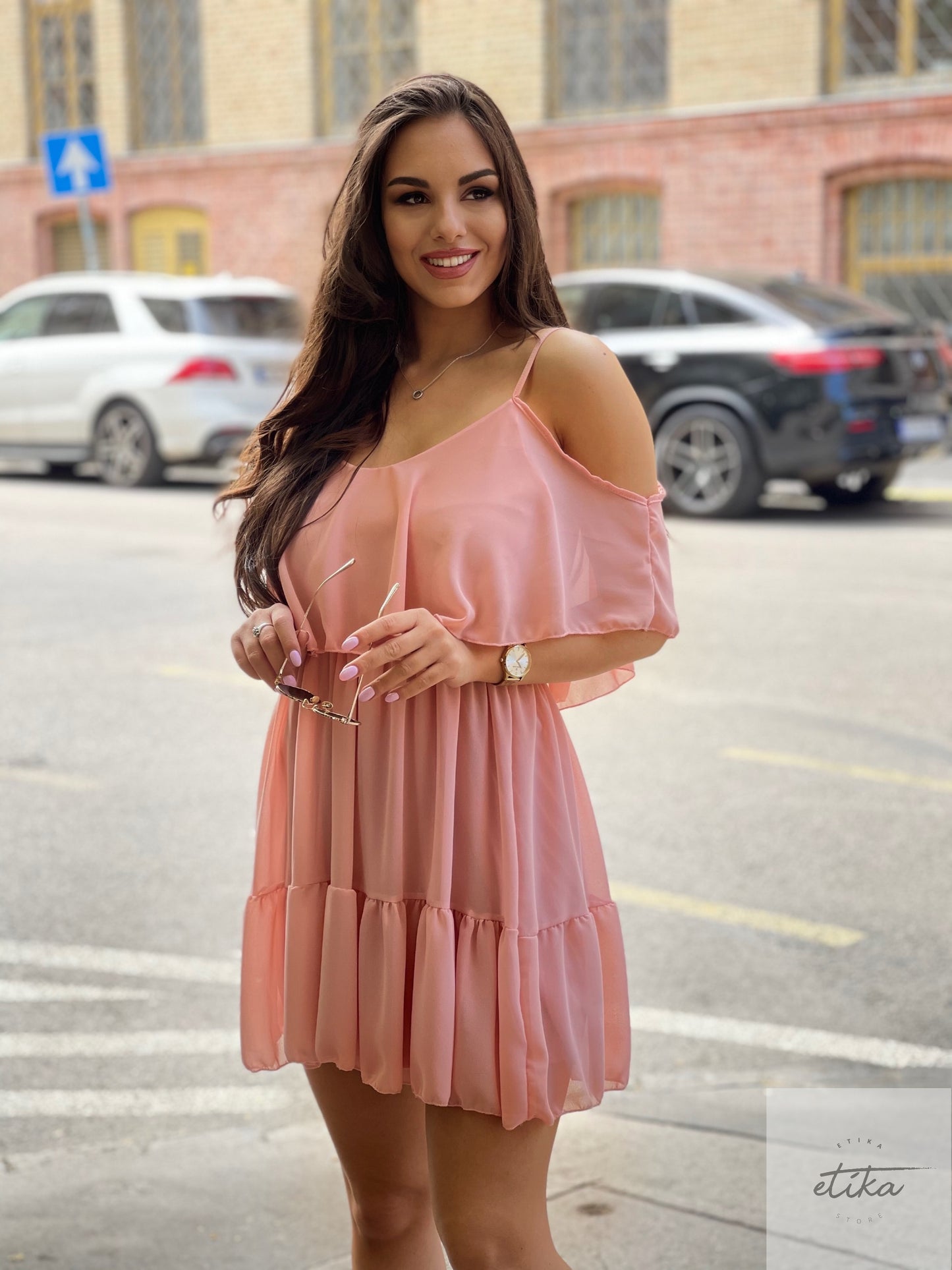 Dominika ejtett vállú, fodros,csodaszép világos színű ruhánk is megérkezett.